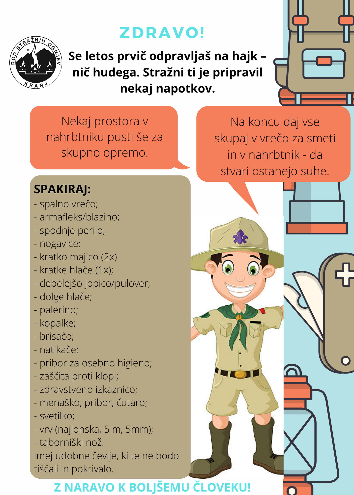 V ta namen morate GG-ji spakirati dva ločena kosa prtljage. Potrebovali boste velik nahrbtnik, v katerega boste spakirali vse potrebno za hajk in potovalko za na tabor. Slednjo boste oddali pred taborniškim skladiščem (pri AMZS-ju na Zlatem polju) v petek 3. 7. 2026 ob 17. uri. Ta vas bo pričakala na tabornem prostoru do vašega prihoda.
