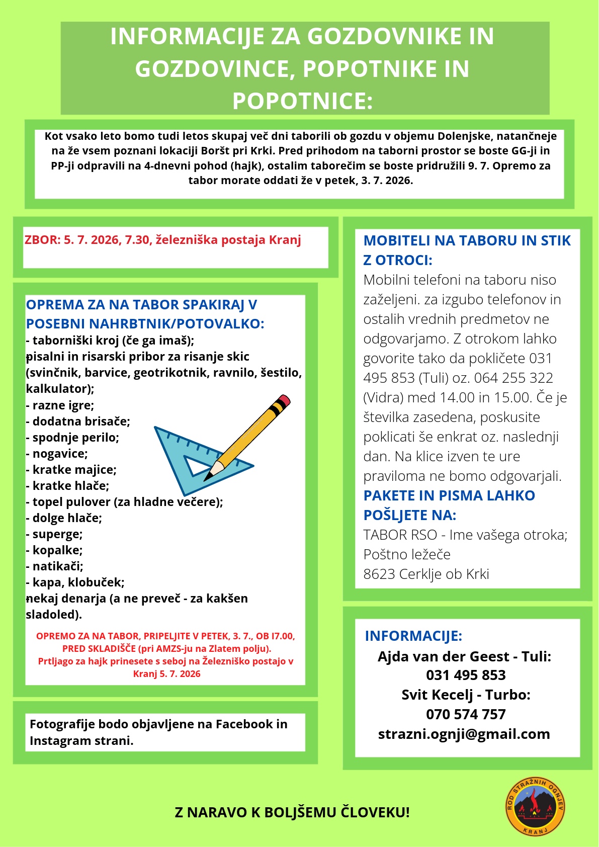- GG, PP (mladostniki od 12 let): zbor na ŽP Kranj 5. 7. 2026 ob 7.30